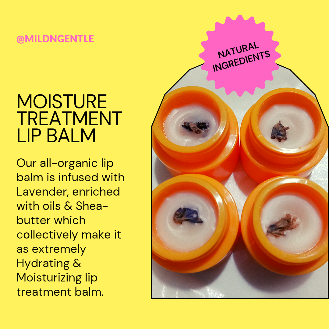 Mild & Gentle presents its Ultimate 24/7 Lip Hydrating, Soothing, Plumping, Repairing, Healing, Extremely Moisturizing and thoroughly Natural “Moisture Treatment lip Balm (with Reusable Applicator)” which is Primarily Based upon Lavender Essential oil, Lavender Extracts (in the form of dried lavender Flowers), Raw Shea-Butter, Peppermint oil, Vitamin E, Coconut oil, Almond oil, Castor oil, Rose Essential oil, Aloe Vera Extracts, Glycerin and Beeswax.